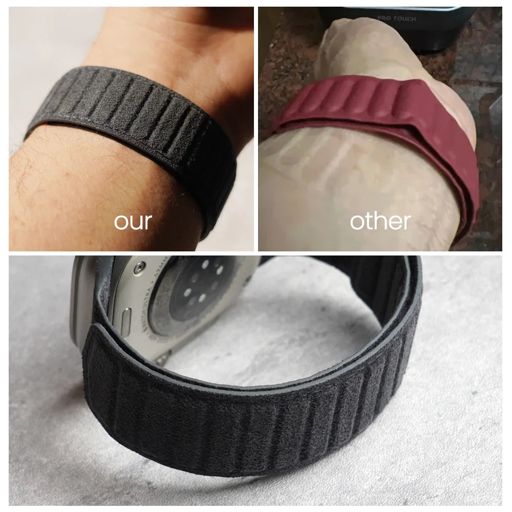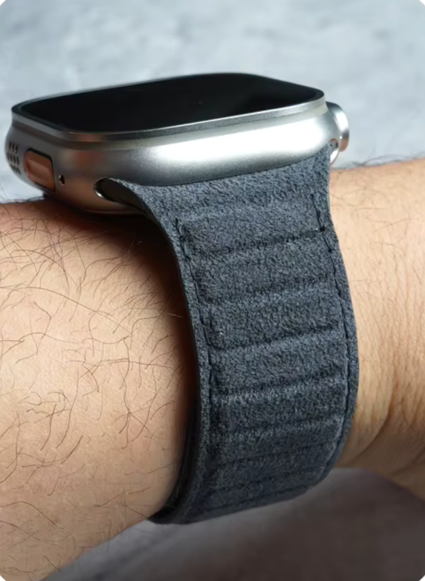 Verleihen Sie Ihrer Apple Watch einen Hauch von Stil – mit unserem hochwertigen magnetischen Alcantara-Armband, das italienische Eleganz mit moderner Funktionalität vereint.